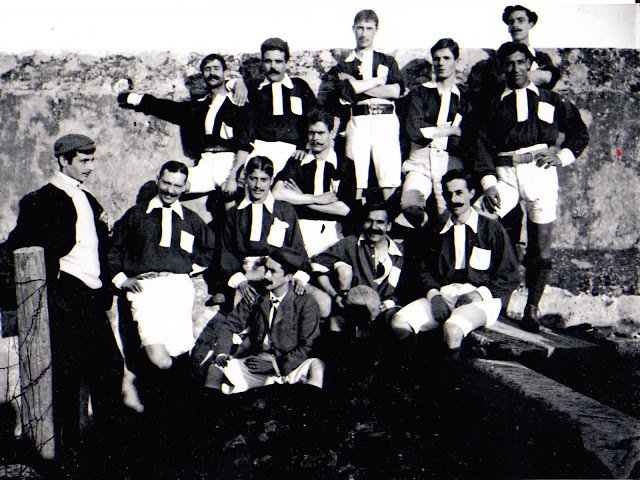 (um grupo de jovens garbosos, ainda com as gloriosas camisolas do Sport Lisboa. Encostado ao muro - sem bigode -, um tal de Marcial Freitas e Costa, meu tio-avô)